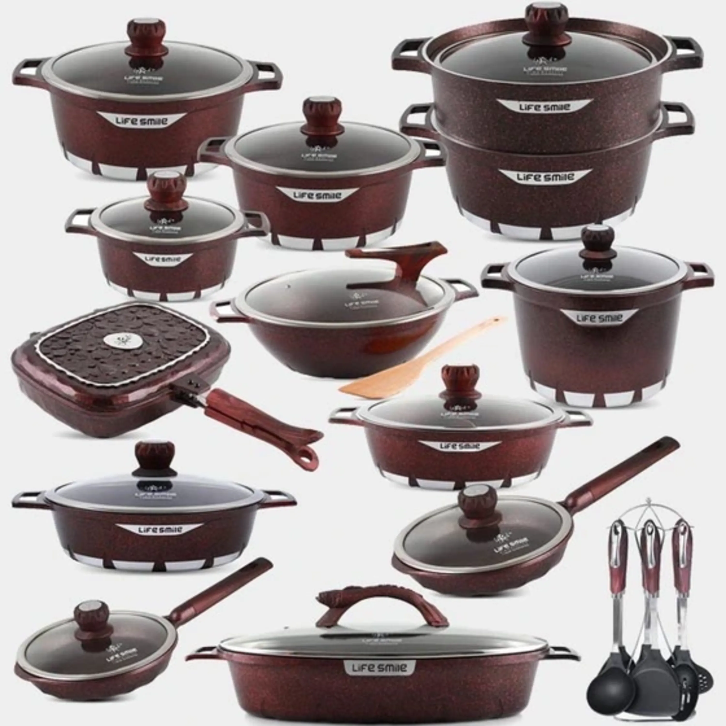 تمام آنچه شما نیاز دارید شامل: 20 سانتی متر (2.3 لیتر)، 24 سانتی متر (4.1 لیتر)، 28 سانتی متر (6.9 لیتر) قابلمه پخت و پز و تقویت کننده; دیگ بخار 32 سانتی متری (9.5 لیتر) و تقویت کننده ماهی تابه 20 سانتی متر (1 لیتر)، 24 سانتی متر (1.6 لیتر) و ماهی تابه دیگ کم عمق 32 سانتی متر (5.8 لیتر) و تقویت کننده 28 سانتی متر (4.4 لیتر) دو دسته Wok & قابلمه عمیق 24 سانتی متری (6.8 لیتر) و آمپر؛ تابه گریل دوبل 32 سانتی متری & هات پات 28 سانتی متری (4.4 لیتر) و آمپر؛ ماهی تابه 42 سانتی متری (5.4 لیتری) و تقویت کننده ملاقه سوپ نایلونی & نایلون ترنر & قاشق سوراخ دار نایلونی & قاشق نایلونی & صافی نایلونی & نایلون شکاف ترنر & ترنر چوبی